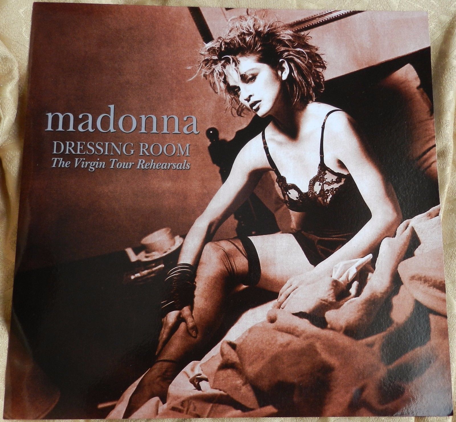 Madonna like a virgin and true blue plus the new track spotlight hous ed in the glossy picture sleeve with the rare gold obi strip with the madonna and dancing liner.